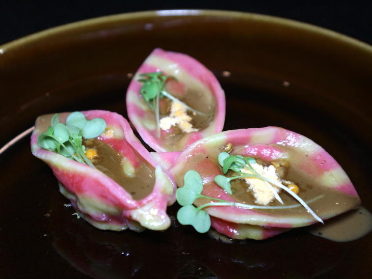 隠し味のキムチがいい味出しています。じゃがいものカンノーロはパリパリとしていて、揚げた蕎麦と同じ食感でした。