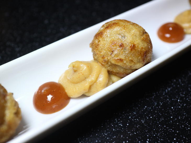 ▲たコ焼き(たこ焼きをもじっています)、トルティーヤのピューレ、タコソース