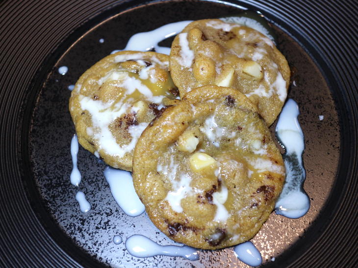 ▲マカダミアナッツとチョコチップのクッキー、ココナッツのドゥルセ・デ・レチェ、アングレーズソース