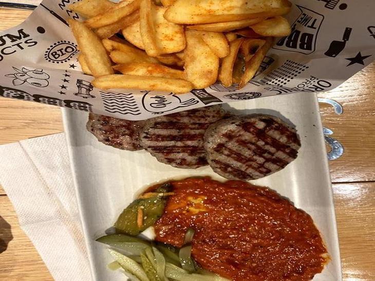 シュケンベ・チョルバ(牛の腸を使ったスープ)と、キョフテのリュテニッツァ(ブルガリア版ハンバーグ、トマトソース添え)。