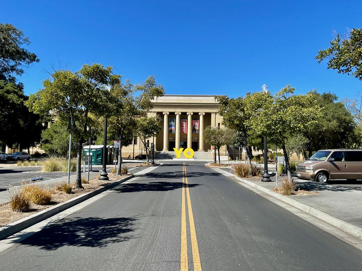 降車駅のパルアルト(Palo Alto)。駅南側に待機しているのが、キャンパス行き無料シャトルバス"マーガレット(Marguerite/サイトこちら)"Y Xがキャンパス内をループするので便利です。今回は大学にあるミュージアム"カンターアーツセンター(Canter Arts Center)"に行きたかったので、ドライバーさんに尋ねたところ、とにかく乗りなさいと言われ、途中で下ろしてくれるという親切ぶりでした。シャトルには、学生や職員に混じり、明らかに観光客と思う人達も乗っていました。座席は皮張り、スタンフォード大学のロゴが刺繍、おぉさすが私立!高級感あふれるシャトルバスです。