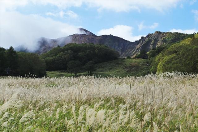 駐車場をスタートし、風に揺れるススキの先に磐梯山(剣ヶ峰)を望みます。