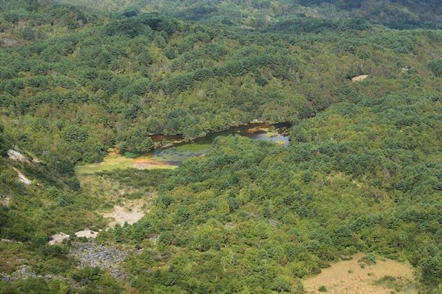 小さな池やシダ類が林床を覆う樹林帯を進みます。