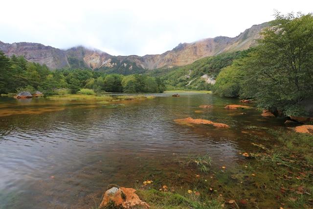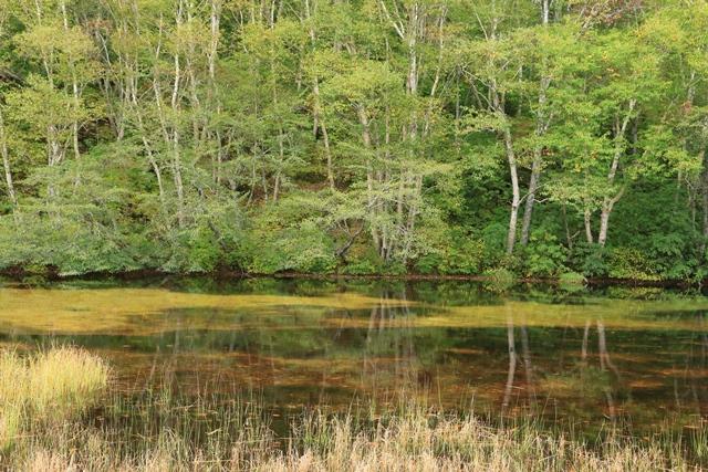 やや進んだ先の沼では、風の影響がほとんど見られずきれいな水鏡となっていました。