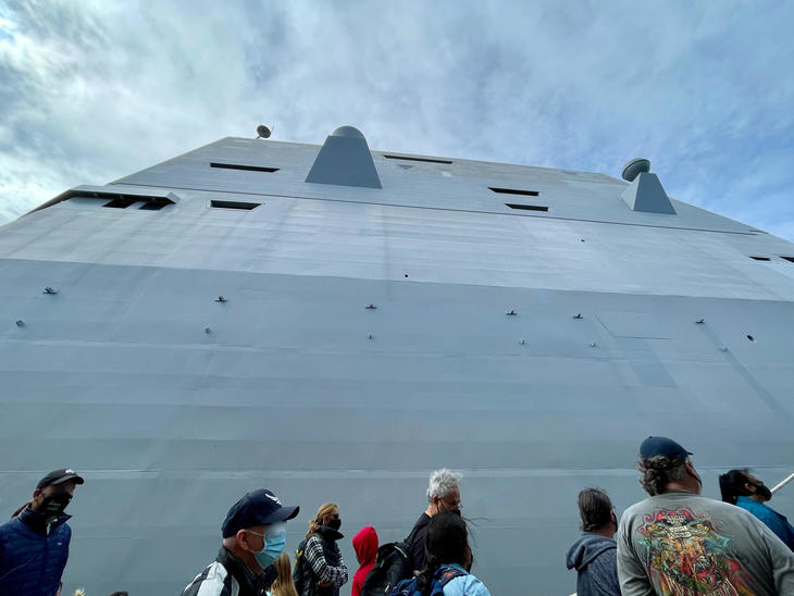 船内見学ツアーの目玉となった"ドック型揚陸艦ラッシュモア(USS RUSHMORE)"公開時間前からピア30/32のフェンス前に並びました。フリートウィークの見学は全て無料で先着順です。船内には、20人ずつのグループに分かれ、ラッシュモアの隊員さんがガイド役を引き受け、各ポイントには、その部署の隊員が説明をします。
