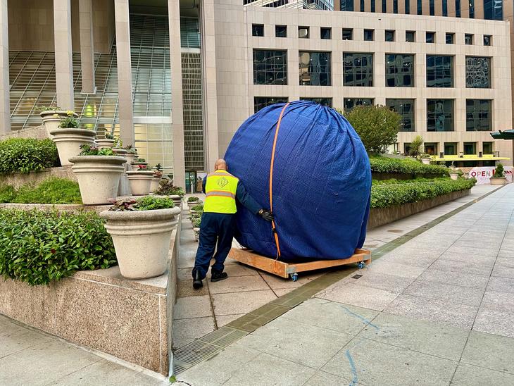 こちらは、巨大オーナメントです。場所は、居酒屋スタイルの日本食レストラン『パブ(Pabu/サイトこちら)』の前に設置されます。日本の10トントラックに相当する大きさの大型車両から、パレットに乗せらてフォークリフトで引っ張り出して、そこからは人の力で押していきます。微妙に登りなのでバランスよく転がすのがコツみたい。