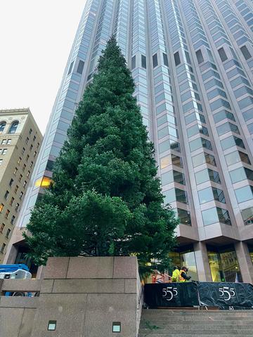 ファイナンシャルディストリクトのランドマークが、バンク・オブ・アメリカ(通称バンカメ)、感謝祭前の土曜日、朝6時頃から設置作業が始まりました。クレーンで吊り上げ設置、無駄な枝は切り取ります。こんな早朝から見に来る人もなく、しばし見物させてもらいました。作業員の方達同士、英語とスペイン語で確認し合うのはカリフォルニアらしいです。