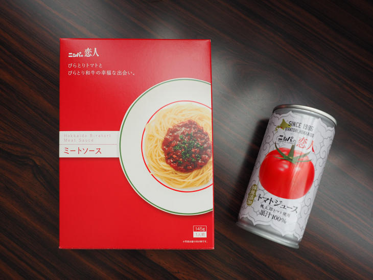 写真は「北海道産びらとりトマトとびらとり和牛のミートソース」と「ニシパの恋人トマトジュース」。