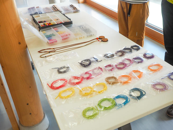 ビーズの小さな穴にひも通しやすくするため革ひもの先端を斜めに切ったり、ビーズの順番や向きを考えながら作業を進めます。