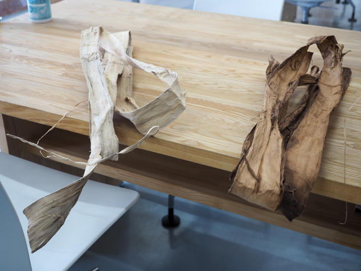 やわらかくなった木の皮は、1枚ずつ薄く剥がして乾燥させ、さらに1本ずつ細く糸に割いていくそう。