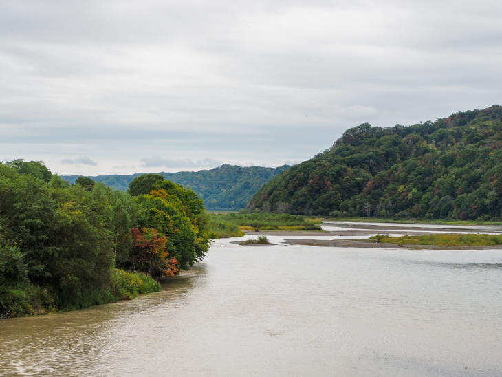 沙流川にかかる橋です。沙流川の流れと森の景観がよく見えるスポットです。