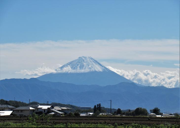 富士山は、2021年は、9月26日に初冠雪が観測されました。これは韮崎市の国道141号線桐の木の交差点付近から本日撮影した富士山です。