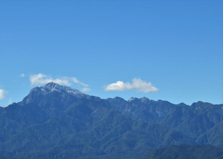 右に連なるノコギリのようにギザギザした感じに見える鋸岳も、かすかに雪化粧していました。