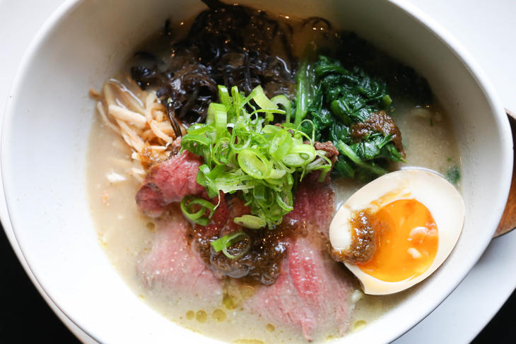 今回、私たちは、豚骨ラーメン、ローストビーフラーメンをおいしくいただきました。 どちらのラーメンスープも、生姜ベースのスープに生野菜(玉ねぎ、パクチー、人参、きのこ、八宝菜、ネギ)が豊富で、とてもヘルシーで体がじんわりと温まるのが印象的な一品でした。