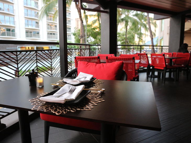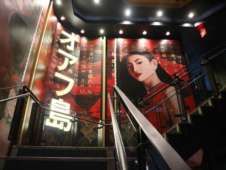 内装は今までよりもグッとアップグレード。外壁には玄武岩を使用して、ハワイとアジアの融合をコンセプトに重厚な雰囲気です。メインダイニングにはフェニックス出身アーティストのナイラ・リーが「集いの島、オアフ」をテーマにインパクトのある壁画を描きました。