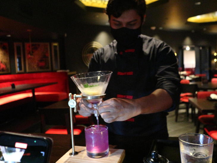 ジンをベースにレモンとサトウキビから取ったケーンシュガーそしてバタフライピーフラワーの抽出液をカクテルにしたゼンガーデン(禅の庭園)。目の前でドリンクの色が変わるパフォーマンスは必見です。
