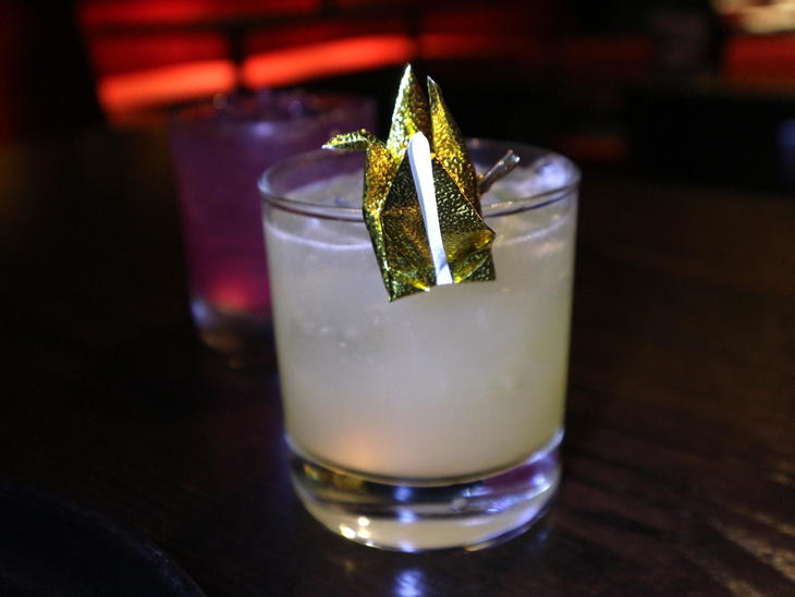 テキーラに梅酒とグレープフルーツそしてレモンとシナモンを加えたゴールデンクレーン(金色の鶴)には丁寧に折られた小さな折り鶴がついてきます。