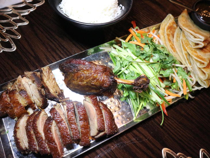 メインの 1 つ目は北京ダック。ダックと一緒にたっぷりのお野菜を薄めの皮に包んで食べます。
