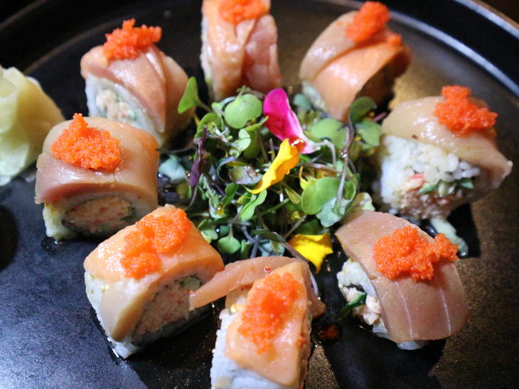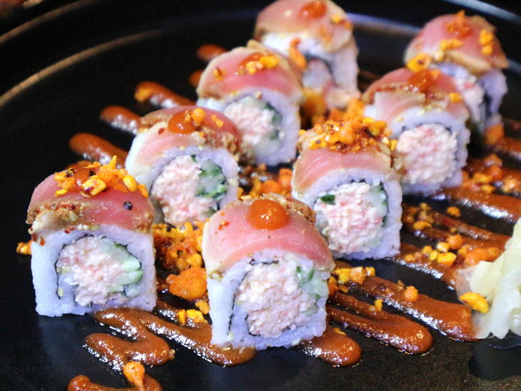 そして、カンパオ・ドラゴンロール。これは、P.F.チャンズのシグネチャーのカリフォルニアロールです。ピリ辛のシランチャソースとよく合います。テーブルには煙の入ったドームに入って運ばれてきます。