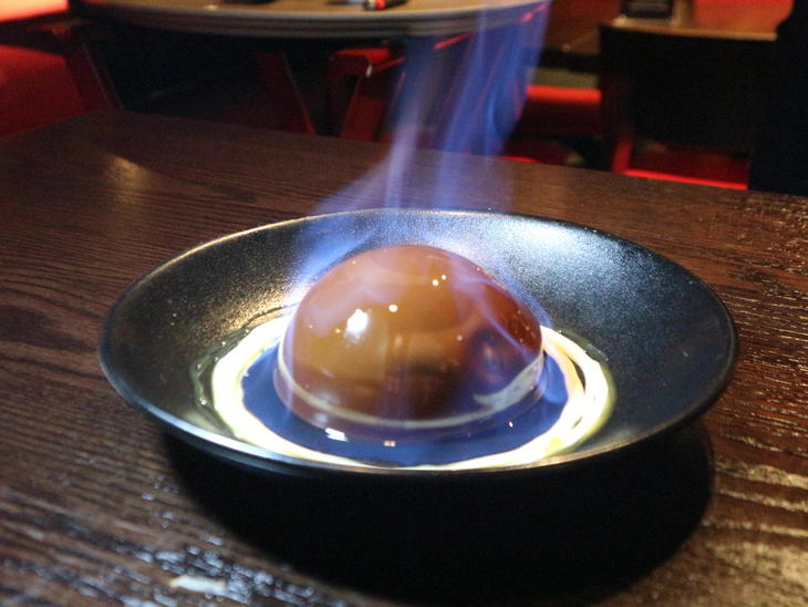 デザートはチョコレートのドームをアルコールに火をつけて溶かすファイヤー&アイス。中にはもちろんアイスクリームが入っています。