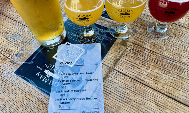 ギルマンブルーインングは、入口で飲み物と食べ物を注文、精算し番号札をもらって席で待ちます。歩道に面しているアウトサイドならワクパス提示の必要ありませんが、タップルームの飲食は、IDと合わせて提示が求められます。8月20日以降サンフランシスコのインドアダイニングでワクパス提示が施行されて以来、近郊のレストランも徐々に提示を求めるような方向になっています。ビールのスタイルも豊富で、なんと25種類のタップビールがありました。正直迷います。迷ったら一番人気を頼んでみましょう。
