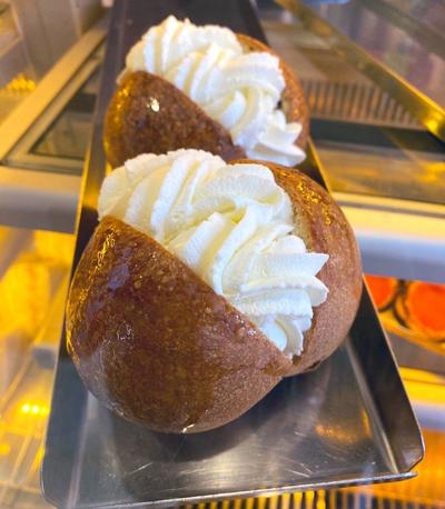 ↑ 近所のバールのマリトッツオ。ふわふわの生クリームがかわいい食べ物です。マリトッツオはローマが発祥の地です。朝ごはんやおやつとしてもいただきます。