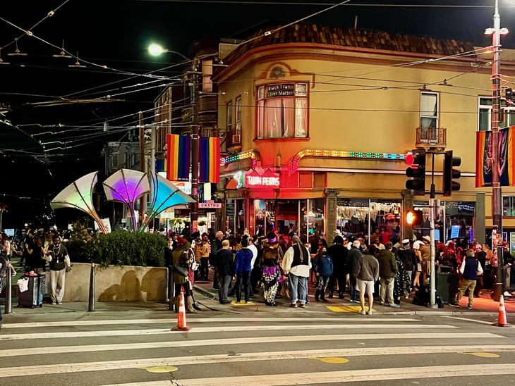 ミュニメトロ・カストロ駅を降りると、ゲートウェイバーで有名なツインピークス(Twin Peaks Tavern サイト)前は、仮装した人、人、人でした。この夜は少し暖かったので、ほぼ生まれたままの姿の人も!"見えない"コスチュームだそうですよ。