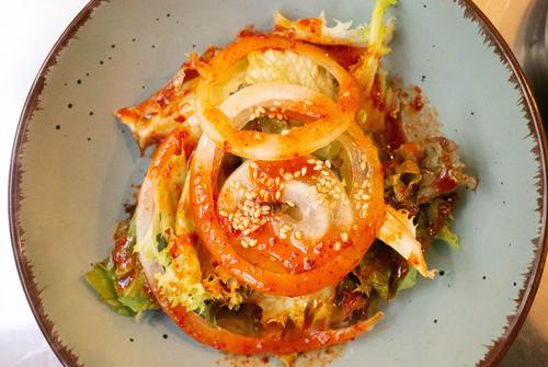 前菜は、これまでに食べたことのない味の料理もあり、なかでもコチュジャンサラダは、甘辛のソースがレタスや玉ねぎと合っていてハマるおいしさです。