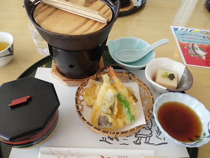 しのうどんは本来、丼に入ったものですが、ここでは寄せ鍋風にセッティングされて出てきました。しのうどんのほかにも胡麻豆腐や天ぷらの盛り合わせもついています。