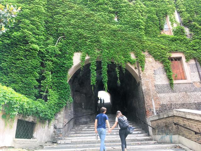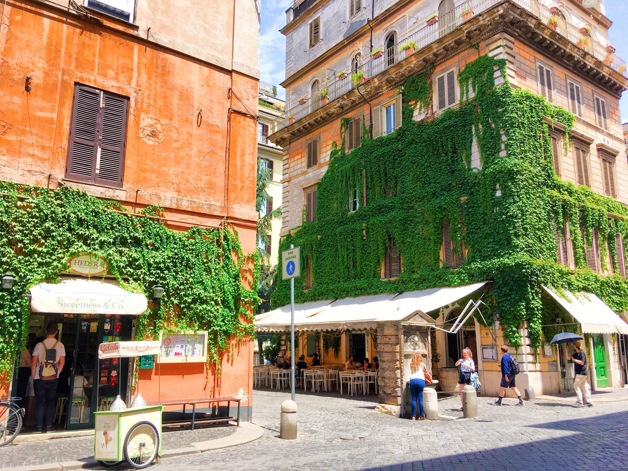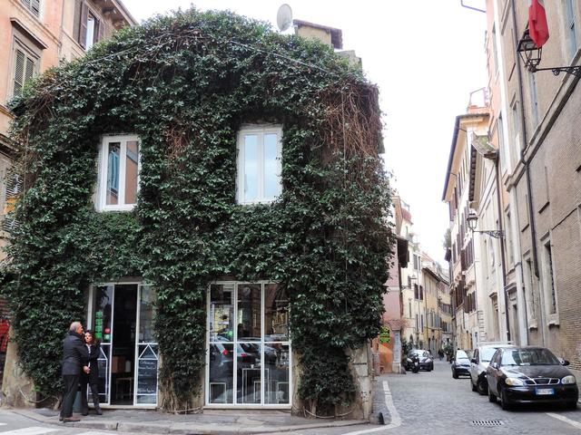 ↑ 続いて、こちらはバチカン市国のサンタ・アンナ門からのびる通りにある建物です。この通りは、ボルゴ・ピオ(Borgo Pio)という名称で、Googleマップにも「噴水がある魅力的な石畳の通り」と地図上に記載があるほど、雰囲気のすてきな通りです。サンタ・アンナ門の方から歩いてきて中盤を過ぎた頃、向かって左側に緑色の建物が見えてきます。もふもふと美しくツタで覆われ、1階にはサンドイッチ屋さんなどがあります。