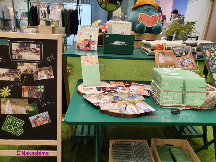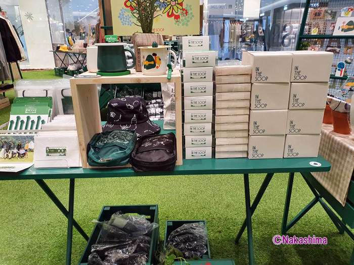 1階にはブルガリ、バーバリー、プラダなどのブランド店が並ぶなか、【IN THE SOOP】のポップアップ店があります。IN THE SOOPは、JTBCで昨年BTS編、今年にはBTS編シーズン2とセブンティーン編が放送されたHYBE制作の番組で、なかにはBTSやセブンティーン関連グッズなどが販売されています。