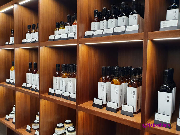 また、高級ゴマ油やエゴマ油のほか、椿油やクルミ油などの天然植物油や、種類豊富な酢や自然調味料などが棚にきれいに並べられて販売されている【名人名村】があります。