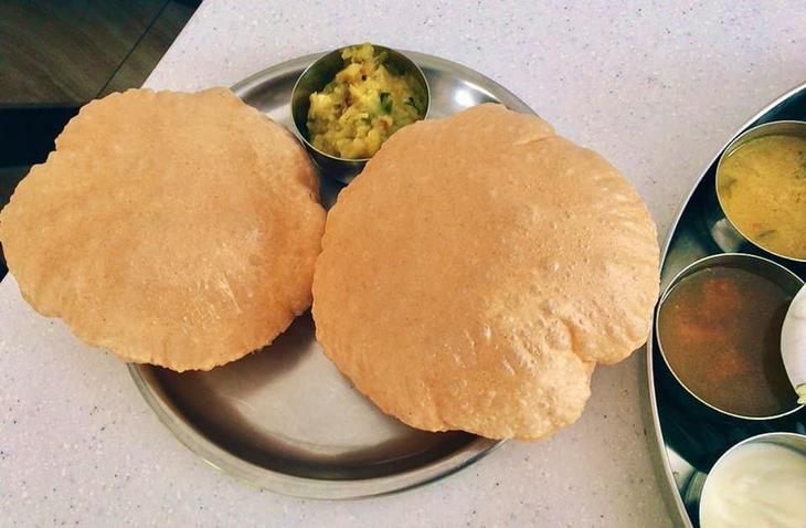 風船のように膨らんだ「プーリー」は、全粒粉の生地を薄い円形にのばして油で揚げたもの。中は空洞になっています。「ナン」や「チャパティ」のように、通常は主食として食べます。