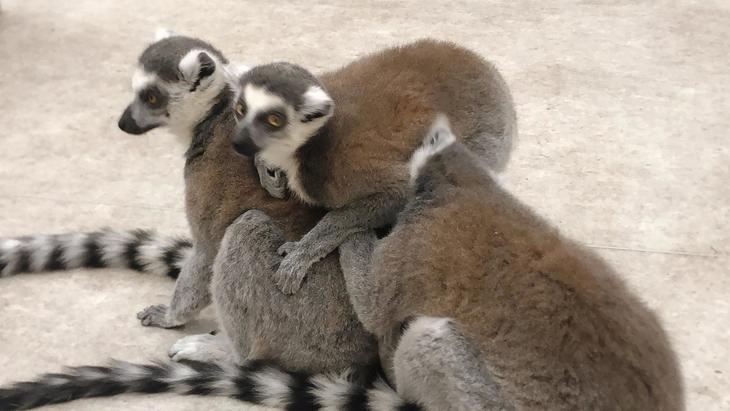 人の肩に飛び乗ったりと元気いっぱいのワオキツネザル。