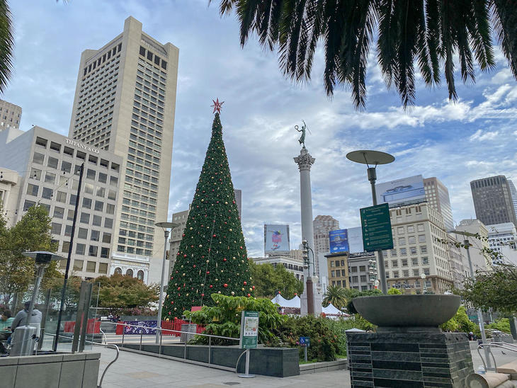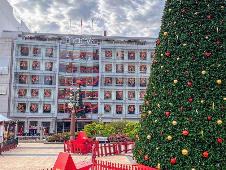 サンフランシスコの主要観光地、ユニオンスクエアに今年も巨大なクリスマスツリーが登場しました。ツリーの点灯式は毎年感謝祭の翌日ですが、昨年はコロナ禍で点灯式は中止。今年は11月29日に点灯式が行われます。