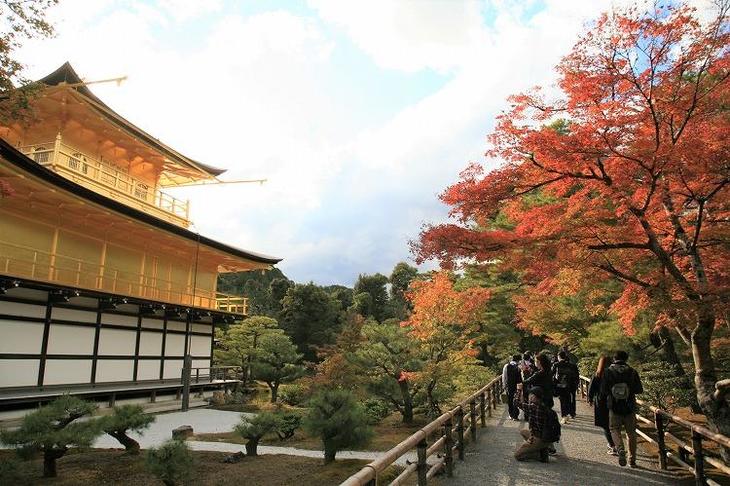 鏡湖池を中心に、さまざまな角度から金閣と紅葉が楽しめますよ。