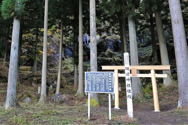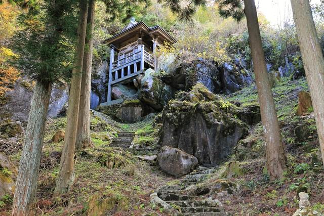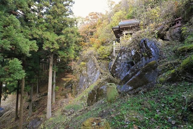 駐車場前より、左奥に上遠薬師のお堂と磯前(いそざき)神社