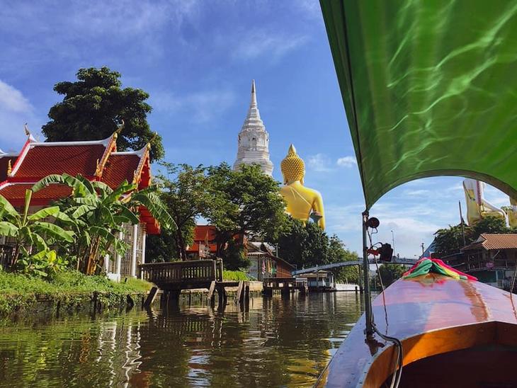 ボートには屋根がついているので、あるていどの日差しは避けることができます。しばらくすると、2021年6月に人気の映えスポット「ワット・パクナム」に完成した「金色の巨大仏像」が見えてきました!