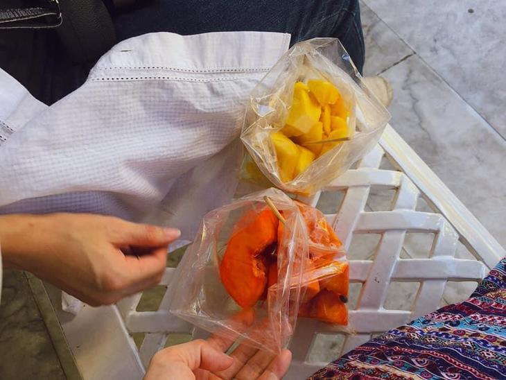 ツアー開始早々に「これをお食べ」とフルーツや焼き鳥を広げてくれ、ブランチがスタート。ここでもタイ料理に関する現地民ならではの情報を、たくさんシェアしてくれました。