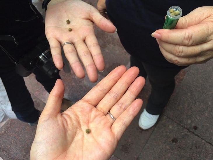 散策中にみつけた、小さなプラスティックの円筒に緑褐色の粒がたくさんはいっているこちらの商品(20バーツ)。