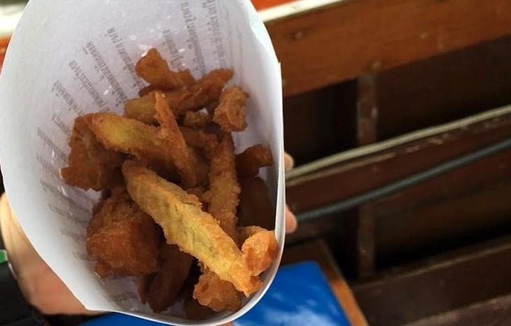 運河をボートで走っていると「揚げ物」を販売する水上ボートとすれ違いました。Nuiさんが「これ、めちゃくちゃおいしいわよ」と言うので、食べてみることに。