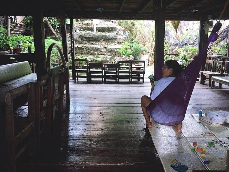 Nuiさんが「調子はどう?」となかにいた女性に声をかけると、彼女はハンモックに揺られながらこう答えてくれました。「コロナで仕事がなくて、ずーっと家にいたから、激太りしてたいへんよ」。