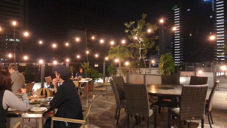ここのテラス席は、今ブルーに光り輝くグランモール公園のライトアップを目の前で楽しむことができる