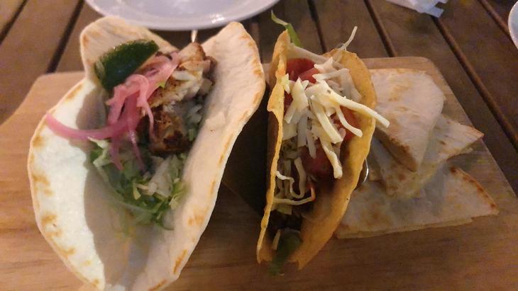 ケサディーヤ・メキシカンチキンステーキタコス・クリスピータコスの盛り合わせも。(1480円/税込)