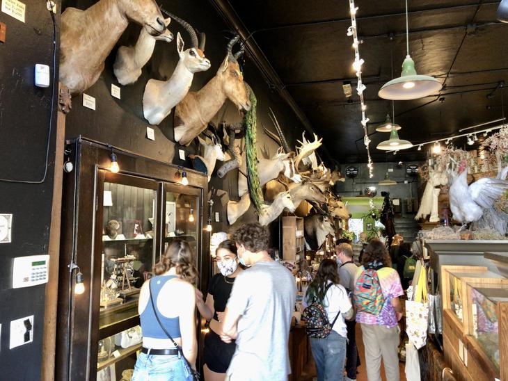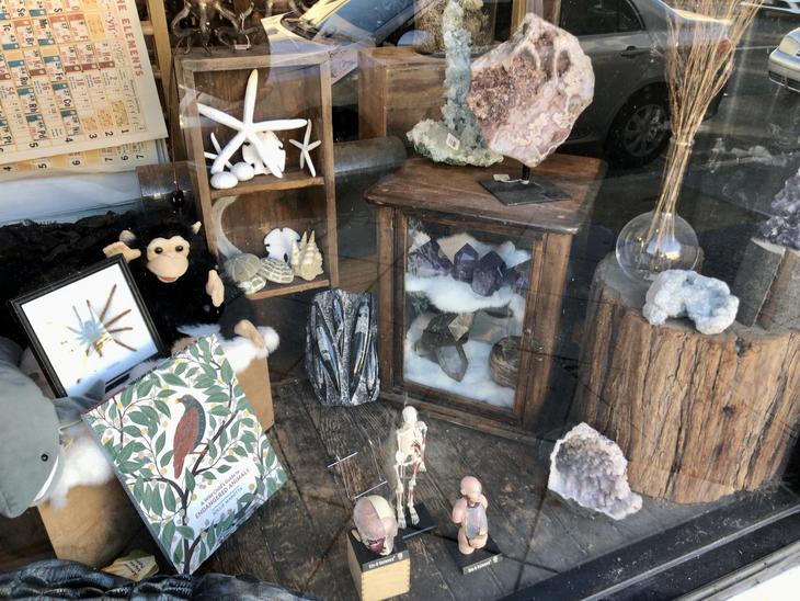 次に訪れたのは、サンフランシスコで今若者に一番人気の場所、ミッション地区のバレンシア通り(Valencia st)です。こちらには、最初の写真のベジタリアン日本レストランChayaや、抹茶専門店Stomemill Matchaなどもありますが、なんといっても楽しいのは古着店や骨董品店巡りです。写真の骨董品店(Paxton Gate)は、動物のはく製や化石、動物のホルマリン漬けなども扱っているお店です。三葉虫やアンモナイトの化石が展示してありました。店内はけっこう混雑しています。