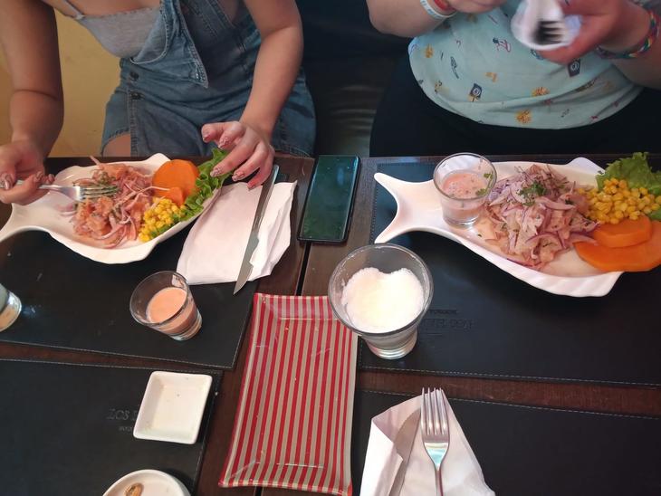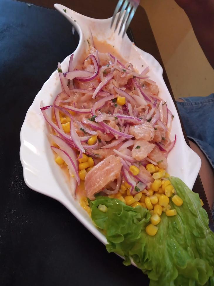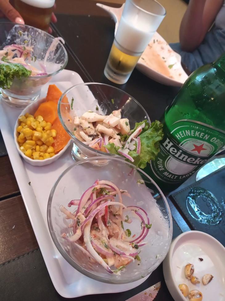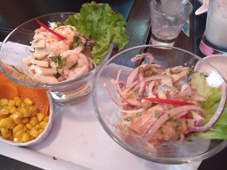 わたしのお気に入りはこの3色セビチェです。味が違うのが楽しいです。