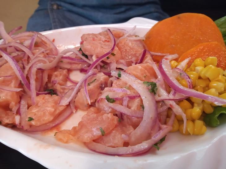 さて、1色つまり、LENGUADO 舌平目、SALMON サーモンだけを頼みますと、その2品のミックスがおいしいんだそうです。付け合わせのLECHE DE TIGRE タイガーソース、これがまたおいしい。