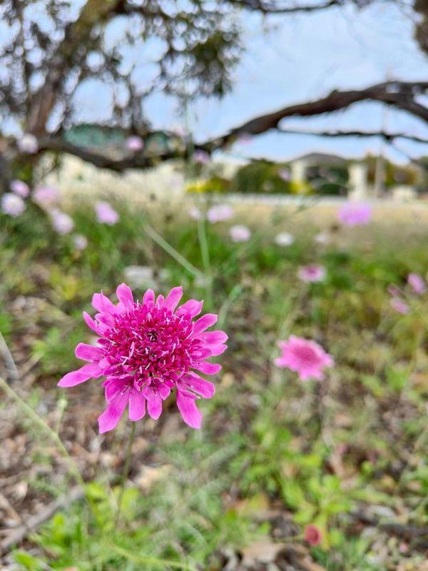 ↑クナウティア・アーベンシスは、雑草のようにあちらこちらに勝手に生えているという感じ。茎が細いので、強風でかなりユラユラしています。