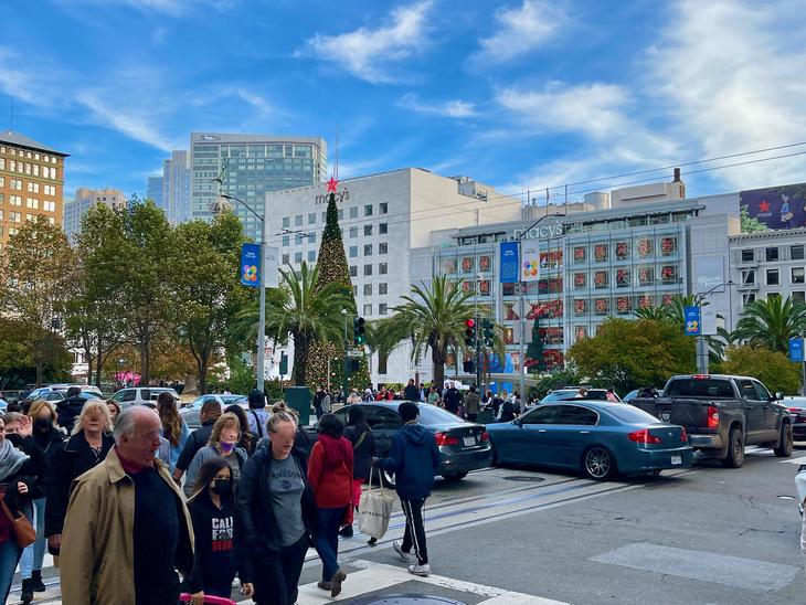 コロナ前に比べたら、ずいぶん歩きやすかったブラックフライデーのユニオンスクエ。ショッピングを終え駐車場に向かう家族連れやカップル、友達が歩いている様子がありました。交通整理もさほどなく、クラクションの音も聞こえない繁華街でした。