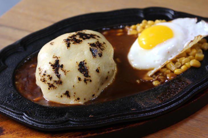 たっぷりのデミグラソースにチーズで包んだ自家製ハンバーガーステーキ(250g)にはたっぷりのデミグラソース。目玉焼きと一緒に食べるといっそうおいしいです。